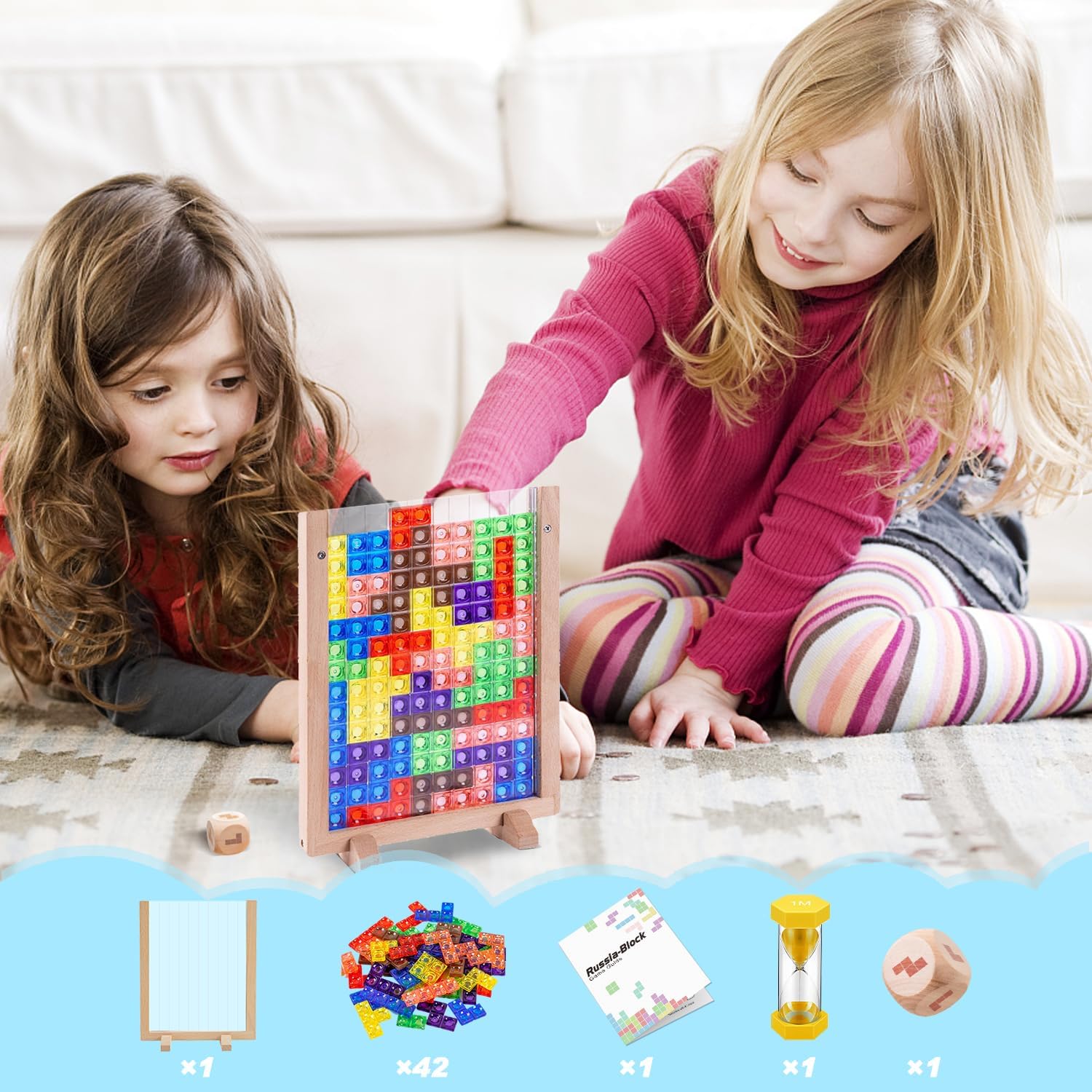 【Clear Instructions and Safe Materials】This building block game has a clear play instructions that you can start playing right away! The Building blocks game consists of 42 Tetrominos, a plastic game board with a beech frame, a dice, and an hourglass timer. All materials have a smooth, burr free surface and are durable.