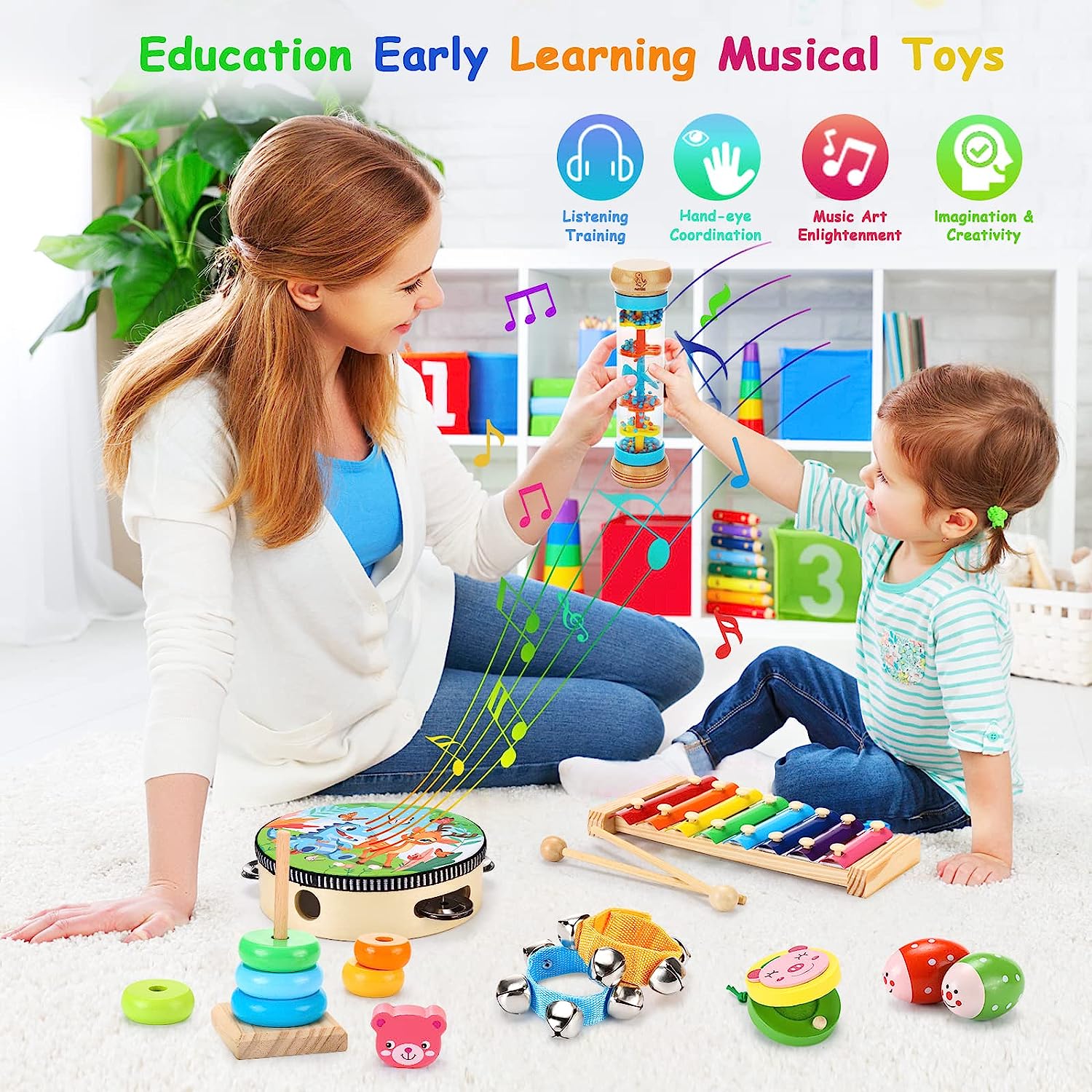Kids Musical Instruments for Toddlers 1-3, Baby Wooden Percussion Instruments Toys Tambourine Xylophone for Kids Ages 1 2 3 4 5 6, Preschool Educational Musical Toys for Boys and Girls Gift
