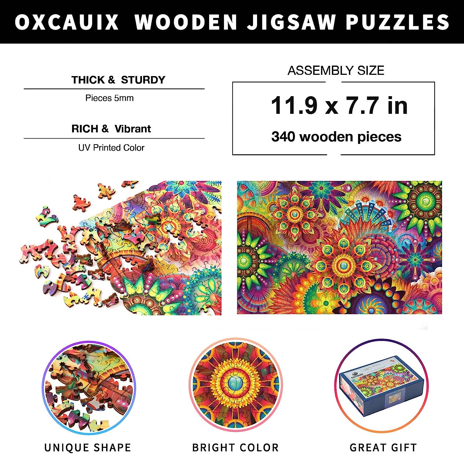 Wooden Jigsaw Puzzles for Adults - Colorful Mandala Flower 340 Pieces Wood Puzzle, Extra Difficulty, 7.7"x11.9", Beautiful Gift Packaging