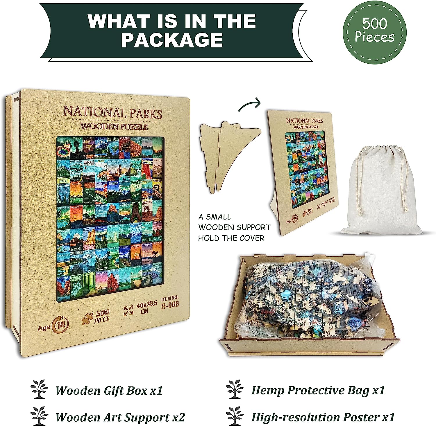 What You Get: You will receive a wooden jigsaw puzzles for adults consisting of 500 unique-shaped pieces, a wooden gift box, two wooden art support, a protective bag, and a high-definition national park poster for puzzle reference.